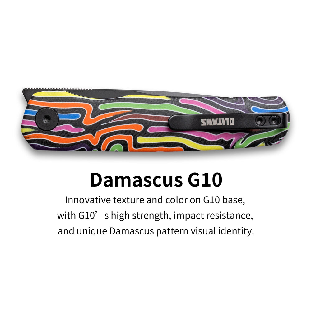 Damascus-Pattern G10 – a special layered G10 laminate featuring flowing, Damascus-like textures. Known for its light weight, durability, comfortable grip, and unique layered visual depth.