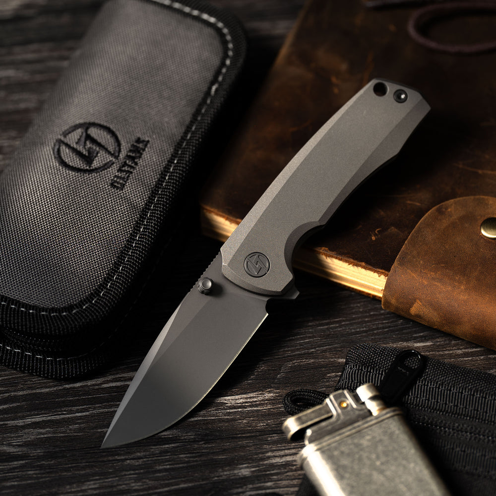 The handle is made from TC4 titanium alloy, machined with precise grooves for enhanced grip and modern aesthetics. The knife opens smoothly via a ceramic ball bearing system and a flipper tab, secured by a reliable frame lock mechanism.